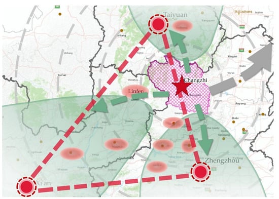 For the transformation of pass-through nodes to hub-type nodes, the regional transportation development pattern was an important foundation and core element for Changzhi to participate in the regional division of functions. Therefore, Changzhi tried to link the regional corridor, where its own value can be identified in the strategic corridor, and it can participate in the division of functions of the core cities of the corridor, enhance its indispensability, and strengthen the competitiveness of the city. If Changzhi can be connected to Xi’an via the Datong–Xi’an HSR to the west, it can be integrated into the Taiyuan–Xi’an–Zhengzhou triangle, thus leading to a greater development potential for Changzhi in terms of regional functions. Changzhi can be transformed from a passing node on the Zheng–Tai HSR to a regional transportation hub node at the T intersection of the Zheng–Tai HSR and the Datong–Xi’an HSR. In addition, a functional identification of the strategic corridors in which Changzhi was located revealed that the Longhai Railway corridor adjacent to Changzhi carries important equipment manufacturing transport functions in China, while the north–south corridor of the Taijiao Railway and the Waji Railway are important corridors for the southward transportation of coal from the north of China. The intersection of these two lines allows Changzhi to assume some specialized functions in China’s logistic network, as well as in the wider urban network, making Changzhi a hub city in the Jin–Shaan–Yu region (Figure 8).