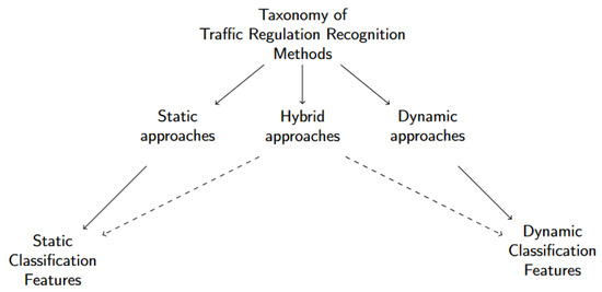 Focusing on the existing TRR methodologies that use non visual data, we propose a new classification of the related studies according to the features used to classify traffic regulations. This taxonomy distinguishes three categories, namely static-, dynamic-, and hybrid-approaches. We call static features those that do not change over time, or if they do, they do so not very often. Such information can be extracted from maps. In contrast, we call dynamic features those that are extracted from dynamic entities that change over time, such as trajectories from moving objects (e.g., vehicles). From the trajectory of a vehicle, the speed of the vehicle, the duration of its stops, etc., can be extracted. Hybrid-based approaches include methods that use a mixture of static and dynamic features. The taxonomy is depicted graphically in Figure 1.