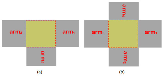 These figures depict the intersection arms of a three-way (a) and a four-way (b) intersections.