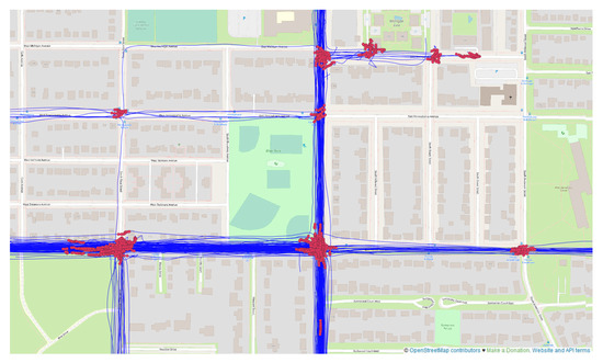 Stop events (red points) detected from the CB-SDoT algorithm in vehicle trajectories (blue lines).