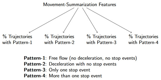 Schematically, this idea is illustrated in Figure 6. Such a mixture of motion patterns has been used in [45], but in a different context. There, the goal was to dynamically determine the range of an intersection for obtaining the traffic flow speed and intersection delay under different traffic patterns. Here, we define movement patterns for summarizing the collective behavior of vehicles at an intersection. The selection of the four patterns was motivated after generating plots of vehicle speed profiles at various intersections and made the following observations: at a traffic light a mixture of patterns was observed where proportionally patterns 1 and 4 were distinct compared to the corresponding values at a priority controlled intersection or at a priority sign.