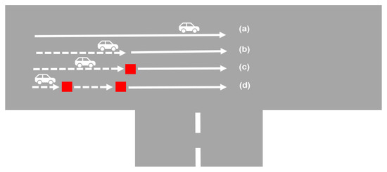 The four movement patterns that describe a vehicle’s crossing of a junction: (a) unhindered crossing, (b) deceleration (dotted line) without stopping, (c) stop once (red dot), and (d) stop more than once (here two stop events are depicted with the two red dots).