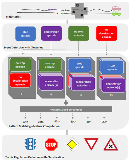 The proposed regulation recognition method is based on the hypothesis that each regulator class enforces vehicles to move on certain moving patterns, and by detecting those patterns we can then recover the regulators. We describe the observed movement patterns by using, as core elements (pattern blocks), the stop and deceleration events, as well as their non-observation, that is, no stop and no deceleration event (four pattern blocks). For example, a movement pattern can be a free crossing of a junction where no stop or deceleration event is observed. Another pattern can be stopping only one time before crossing the junction. Numerous patterns can be defined by combining these patterns blocks. Then, each regulated junction arm can be described from the movement patterns observed at its location, by simply summarizing the patterns (each described by stop/deceleration events) of all the trajectories that cross that junction arm.