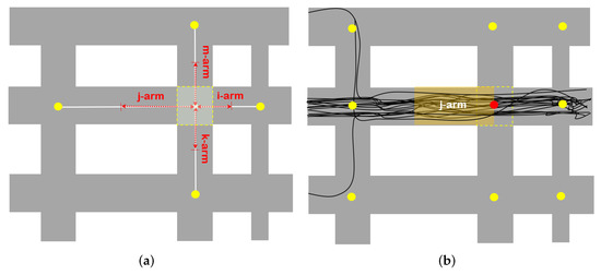 Each intersection (yellow dots) is composed from intersection arms, that connect it to nearby intersections (white lines). Classification features are computed per arm, within half the distance of the road segment that connects the current arm with the one previously visited by the trajectory (red dotted arrows in (a)). For each trajectory (black lines) in (b) that crosses the intersection arm j-arm from west to east, stop and deceleration events are computed within the orange indicated area along j-arm.