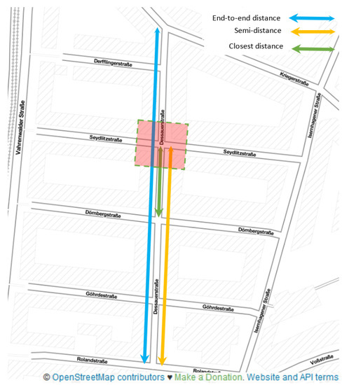 - The end-to-end distance of the street that the intersection arm belongs to (light blue arrow in Figure 9). The length of a street is indicative of its importance in the street network. The same rationale applies also to the other distance-based features (2, 3).