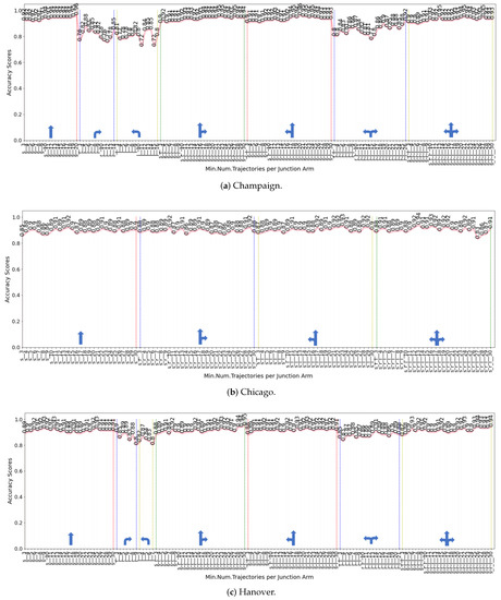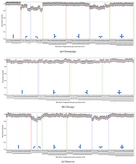 - Excluding the number of tracks to a certain number negatively affects the classification performance. However, with only three straight trajectories per junction arm, classification accuracy is equal to or greater than 85% across all datasets (85% in Chicago, 89% in Hanover, and 92% in Champaign). With only five straight trajectories, accuracy is equal to or greater than 90% (90% in Chicago and 92% in Champaign and Hanover).