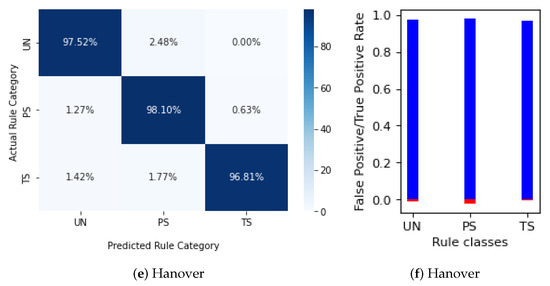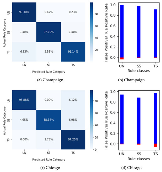 Therefore, by applying domain knowledge rules, there is a gain in accuracy between 1% and 3%, but more importantly, accurate predictions can be made for arms with incomplete data corresponding to 27–50% of the original data. Furthermore, the FPR of the class with the highest FPR decreases between 15.6% and 60% (15.6% in Chicago, 60% in Champaign, and 58.3% in Hanover), validating our proposal to use domain knowledge rules for both recovering misclassified arms and predicting regulators for arms without data.