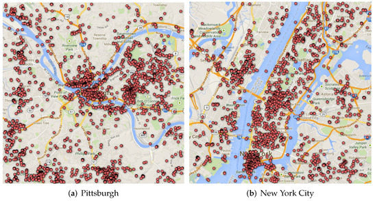 In order to obtain the structure of for both cities we use geo-tagged social-media user-generated content. In particular, we use a dataset (https://www.icwsm.org/2016/datasets/datasets/, accessed on 31 October 2022) provided by [54], where the tweets were collected using Twitter’s streaming API. Twitter’s Terms of Service do not allow the full JSON for datasets of tweets to be distributed to third parties. However, they do allow datasets of tweet IDs to be shared. The provided dataset only contains Tweet ID, we further apply the tool “Hydrator” (https://github.com/DocNow/hydrator, accessed on 31 October 2022) to collect the original tweet post.