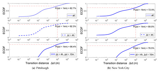The Empirical Cumulative Distribution Function of transition distance under different parameters. The top figure includes all transitions, the one in the middle keeps transitions with time interval h, while the bottom as the setting we select for our later analysis only keeps transitions with time interval h and transition distance m. Our parameter selection captures a majority of the transitions, i.e., for Pittsburgh and for New York City.