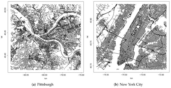 The information of each edge is formalized as a tuple <source node, target node, distance, car, car reverse, bike, bike reverse, foot>, where the distance is the geographical distance between two nodes. car is an integer, for example, 2 means there are 2 lanes available for vehicles in the direction from the source node to the target node, and car reverse represents the capacity for the other direction. Bike and foot represent the accessibility for biking and walking separately. We select two cities, Pittsburgh and New York City, for our experiments, each with a 10 miles rectangle area centered in the city. As summarized in Table 2, there are in total 23,126 (21,886) nodes and 32,475 (34,651) edges for the undirected in the miles rectangle area around the center of Pittsburgh (NYC). Figure 4 further visualizes the road network on the map by using the tool from [55]. In contrast to tweets’ geographical distribution as shown in Figure 2, it is not quite straightforward to understand the relationship between the road network structure and urban mobility intensity. Note that for the road network centrality measure below, we extend the studied area to 15 miles when calculating the node centrality to eliminate the “edge effects” [56] due to artificial boundaries.