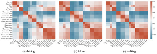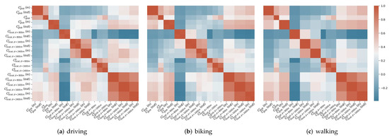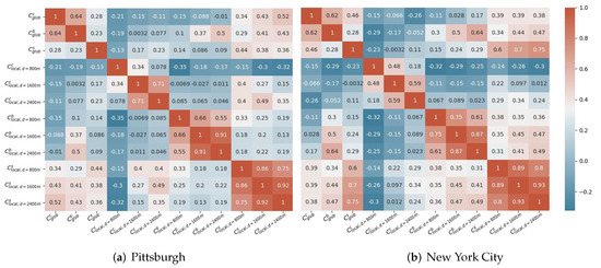 To understand the relationship between different centrality measures, we calculate the pair-wise ranking correlations. Figure 5 shows the ranking correlations between pair-wise centrality measures when considering the street network as an undirected graph, for the two cities of interest (i.e., Pittsburgh and New York City). From the correlation color map, we can see the centrality measure at a global scale often have lower correlations with the one at local scale when d gets smaller. At the global scale, the closeness centrality highly correlates with betweenness centrality but not with straightness centrality. However, straightness centrality at the local scale, especially when , tends to correlate significantly higher with closeness and betweenness centrality at the global scale. Finally, given the same centrality measure at the local scale, e.g., , the pairwise correlation between two local versions drops as the radius d “difference” increase, e.g., with is larger than with , which is expected. However, given the same , the larger the radius, the larger the pairwise correlation since the road networks between two local versions for the same node have a larger overlap ratio, e.g., the overlap ratio is between and versus between and .