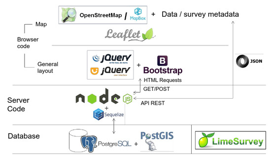 The server code is based on node.js, storing the data in a PostgreSQL database with the PostGIS module, which allows storing and processing of the geographic component. The project, and especially the data model, was inspired by many of the functionalities present in the free software project LimeSurvey. The application receives the survey data from the server in Geojson format, a variant of the Json format for storing JavaScript objects in plain text, which also includes spatial information.