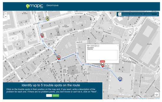 The location of the participant’s address is a mandatory element in the process of answering the questionnaire. To facilitate the location, a map of the area surrounding the participant’s school is presented, which is already identified since the individual school password must be entered to enter the form. As school registration is an earlier process in which the geographical location of the school is also mandatory, this information is always available before students and teachers, or school staff participates. Once the point marking the location of the participant’s home is available, it is possible to trace the route usually followed to travel from home to school. The system allows a line to be drawn that obligatorily connects the point of the home with the point of the educational center. This part of the questionnaire is optional, so if a student has difficulties drawing it, due to age, time, or any other reason, he/she can omit this step. It is allowed to zoom and change the cartographic background to get the clearest information to detail the route of the displacement with the maximum level of detail that each participant wants to use. It is also left as an optional step to indicate on the route some conflicting points (up to a maximum of five) or that present problem in the route. These points are characterized among several types (traffic, sidewalk, crossing, traffic light, or other) to be able analyzed later. In addition, comments can be added, both at these trouble spots and in other sections of the questionnaire.