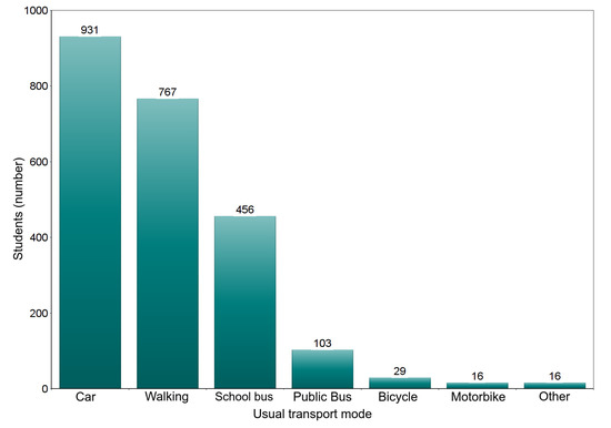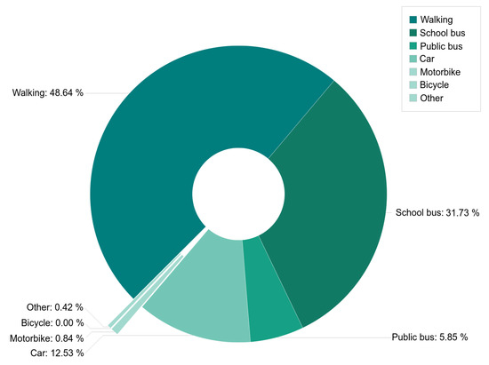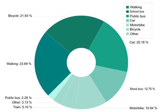 35], while students who usually walk do so motivated by physical exercise and by producing less environmental pollution. The time taken to travel was the issue that most concerned the respondents. Most students took 20 min or less to reach school grounds. There is a widespread belief that walking is slow; however, according to the results obtained, it was found that the fastest trips were those made on foot and by car. It was also observed that the combination of different means of transport is quite widespread among the population analyzed, with the most common connection being the school bus in conjunction with car transport. Although the car was the most used means of transport, the students responded that they would prefer to travel on foot or by bicycle if they had the opportunity to choose their transport. This result is surprising since only 29 of the 1883 respondents indicated bicycles as their usual means of transportation, being used preferably for recreational purposes. On the other hand, the low preference shown for the public bus is remarkable, representing only 2% of the participants.