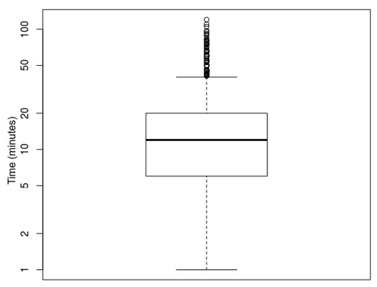 32]. These speeds were 4 km/h for pedestrians, 10 km/h for bicycles, and 30 km/h for motor vehicles. With the first restriction, 130 records cleaned, obtaining 1773 results, and with the second restriction, 1329 records cleaned, obtaining 574 valid data for route times. The travel time values that could be correctly validated were subsequently analyzed in the geospatial analysis.