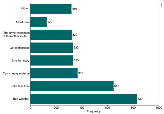Although the preferred means of transport for the students were cycling and walking, most home–school trips were undertaken by car and walking in urban environments, and only a minority used a bicycle as a means of travel, using it only for recreational use, regardless of student age and the environment in which they live: urban or rural. Proof of this was that most of the students surveyed lived less than 1 km from the school in urban environments, distances accessible to most pedestrians and cyclists and, despite this, the majority of trips were made by private vehicle. The reasons given by the students were mainly to avoid bad weather and the need to carry heavy school materials.