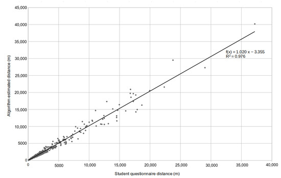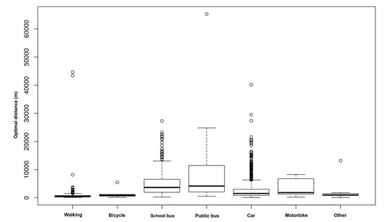 Finally, it was observed that, although the average school travel distance in the sample analyzed was 2593 m (a greater distance than that found in other studies such as [