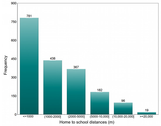 39], where the average distance was 1623 m), the majority lived less than 1 km from their school, 16% of whom lived between 400 and 750 m away. These distances are feasible for daily walking and cycling, as shown in [