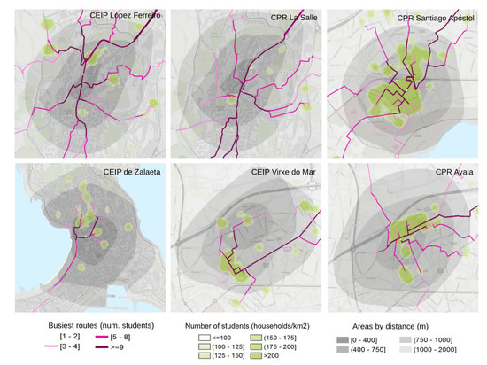 https://cartolab.udc.es/geomove/ (accessed date: 28 August 2022)) project, in which the specific case of different schools in Galicia (Spain) has been studied. This region, located in the northwest of Spain, has a population of 2,695,645 inhabitants, according to [