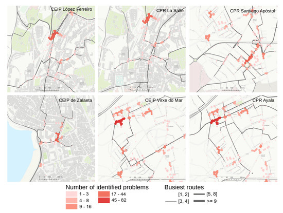 30] algorithm, evaluating the possible routes, using only the existing roads within a maximum radius of 5 km concerning the bounding box defined by the location of the home and the school. The cost of road optimization calculation was established according to the length of the route, so the shortest distance routes were obtained through the network mapped in OSM. Once these routes were available, we identified those road sections (defined as lines between two intersection nodes) that had the highest frequency of use due to the coincidence of several routes of students going to the same school. The number of times that a student potentially used that section to get to school was counted, storing this value on the geometry of the corresponding section for later analysis, but without individually identifying any of the participants, so that only sections with more than three students were represented.