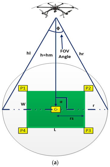 As given in Figure 5a,b, L and W represent the length and width of each sample, rs shows half of the length, r represents the radius of the imaginary circle viewed by the drone camera, h is the vertical height of the drone with respect to ground, hr, hm and hl show the sides of the triangles as perceived in the figures. The field of view (FOV) angle of the drone camera is represented as φ, the angular distance of the drone body from the centroid of the samples is measured by ρ, and α represents the angle between the ground axis and hm. As shown in the figure, the quadrilateral polygon has four corner points, P1, P2, P3, P4, and a center, C.