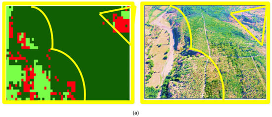 Similarly, Figure 12b shows the classified sub area sample 2 and the corresponding ground data image recorded using the UAV. By comparing the two images, it is concluded that the classified sample area is in good agreement with the actual image. However, a portion of classified sample area below the tagged line represents a mix of vegetation and bare land classes. Figure 12c shows the classified sub area sample 3 and the corresponding ground data image recorded using UAV. By comparing the two images, it is concluded that the classified sample area is in good agreement with the actual image. However, the upper portion of the real image contains some portions that represent the bare land class; whereas, the classified sub area sample 3 does not include such a class. Figure 12d shows the classified sub area sample 4 and the corresponding ground data image recorded using UAV. By comparing the two images, it is concluded that the classified sample area is also in good agreement with the actual image. However, the right middle portion of the classified image contains a bare land class; whereas, the actual image does not include such a landscape.