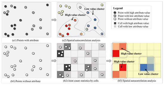 Spatial elements contain spatial and random information. In the spatial autocorrelation analysis, which is represented by Moran’s index and Geary C and et al. [42], the essence of measurement is to analyze the spatial association characteristics of a numeric interest variable of a geographic element. Such a numeric attribute belongs to non-spatial information. The spatial and geometric information of these geographic elements is mainly used to determine the spatial proximity and construction of the spatial proximity matrix. Accordingly, the following question should be answered: How can spatial autocorrelation be measured without a numerical variable for a set of points with spatial characteristics? The conventional methods are illustrated in Figure 1. Figure 1(a1) shows a set of spatial points. Different brightnesses represent different variable values; the darker the color, the larger the value, and vice versa. Specific information is provided in the legend. Given that this set of points has attribute information, global or local spatial autocorrelation can be measured using Moran’s I and other spatial autocorrelation analysis models.