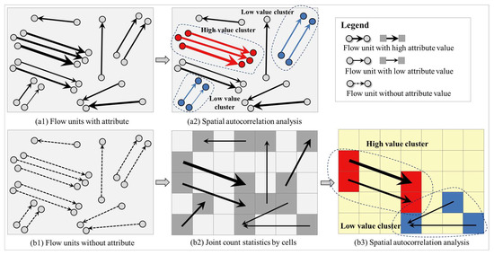 The analysis result is shown in Figure 1(a2). However, spatial autocorrelation analysis cannot be performed directly for other cases, where a set of points may not contain any useful numerical variables. First, a common method is to divide the area where these points are located according to a certain geographic unit (e.g., administrative division, unit, or cell). Second, the number of points in each geographic unit is summarized by using sample statistics. Lastly, this statistic is used as the variable value for this geographic unit. The summary result of points in Figure 1(b1) is shown in Figure 1(b2). Evidently, the geographic units used for spatial autocorrelation analysis become polygons (cells), and the target variable for analysis becomes the number of points in each polygon. The analysis result is shown in Figure 1(b3). In this case, the basic geographic units used for spatial autocorrelation analysis are either points or polygons with numeric variable. Spatial autocorrelation analysis cannot be performed on points or polygons without numeric variable. This case provides the solution when the OD flow faces similar situations.