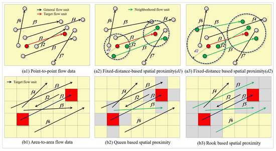 Figure 3(a1) shows the point-to-point flow data with numerical variables. Figure 3(b1) shows the area-to-area flow data with numerical variables. Some rules for determining the proximity between flow units are generic and can be applied to any of the flow units (e.g., fixed-distance and k-nearest). By contrast, other rules can only be applied to area-to-area flow data (e.g., topology-based Queen and Rook). Other more complex neighborhood distance modeling methods include inverse distance and inverse distance squared et al. For flow unit f1 in Figure 3a, if fixed-distance is adopted as a rule and the neighborhood distance is set as d1, then the neighborhood distance of f1’s origin and destination can be determined (see Figure 3(a2)). Only f2 and f3’s origin and destination are within the neighborhood distance of f1. Therefore, only f2 and f3 are the neighbor units of f1. After extending the length from d1 to d2, the result is shown in Figure 3(a3), which suggests that in addition to f2 and f3, the origin and destination of f5 also fall in the neighborhood distance of f1. By this time, the neighbor flow units of unit f1 include f2, f3, and f5.