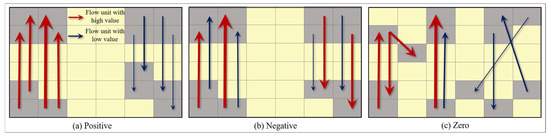 Given that Rook is adopted as the proximity rule in this case, when the flow and target flow units are spatially proximate, ; otherwise, . Thus, the value of is the sum of the neighbor units of each flow unit: