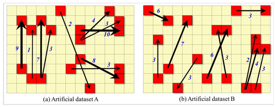 Two artificial flow data sets (The number is the code of each flow unit): (a) Flow data set with discrete distribution characteristics; (b) flow data set with random distribution characteristics.