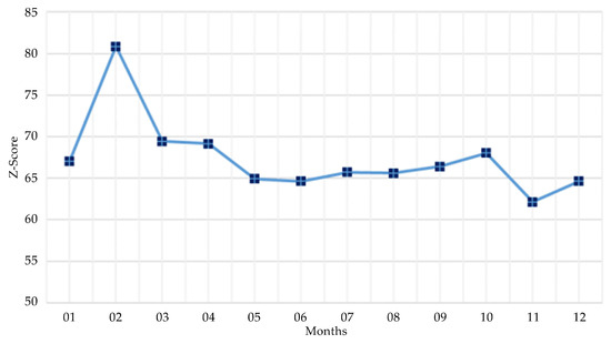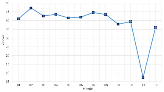 On the basis of the full sample data, we extract all the flow data whose flow rate threshold is above 10,000 for each flow unit. With the same method, only the data that meet the threshold are analyzed. The analysis result is shown in Figure 9. Figure 9 shows that relative to that of the full sample flow data, the z-score of the subsample flow data is generally reduced from approximately 65 to approximately 40. The score for February remains higher than those of the other months, but with minimal fluctuation. The score for November shows the same tendency as the full sample. That is, the z-score is lower than the average value with substantial fluctuation. The z-score of November is far lower than the values of the other months.