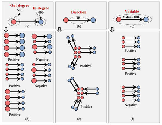 As we have previously emphasized, the data structure from the traditional point and polygon to the OD flow becomes increasingly complicated. For a flow unit, it is composed of the origin, destination, direction, and variable of interest. The target of measuring spatial autocorrelation can be one or more of these variables. Figure 10 shows examples of the spatial autocorrelation analysis of OD flow data from three different perspectives. In Figure 10a, for a group of flow units with adjacent relations, the concern is whether the out-degree and in-degree of each flow unit belongs to the same type. For example, the out-degree and in-degree could be either extremely large or small; that is, the out-degree is large, and the in-degree is small, or vice versa. Following this classification can facilitate the quantification of whether the distribution of OD flow has a spatial autocorrelation and help determine the type of spatial autocorrelation to which it belongs (Figure 10d).