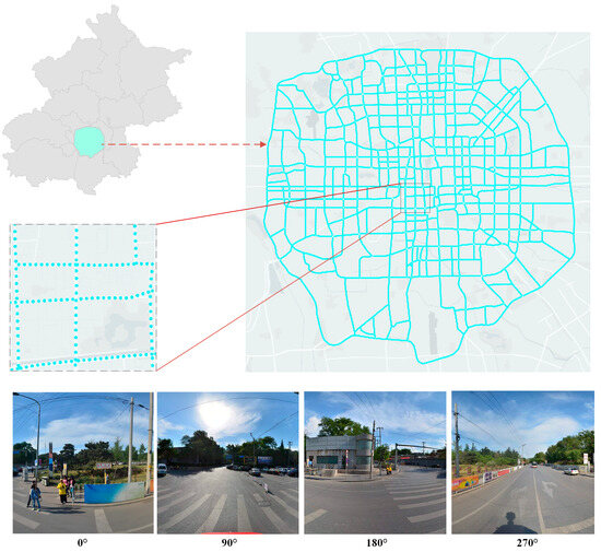 - Street view data—This study utilizes urban street view data to obtain subjective perceptions of the urban landscape. Tencent Maps (https://map.qq.com/, accessed on 12 May 2019) is one of China’s largest online map service providers. Based on OSM road network data (https://www.openstreetmap.org, accessed on 10 July 2019), the processed road network generates sampling points, at a sampling distance of 100 m. The point coordinates are obtained to capture street view images in bulk in the Tencent Map platform’s application programming interface (API). In the street view sampling strategy, each sample point acquires images from four directions (0°, 90°, 180°, and 270°) with a fixed horizontal pitch, as shown in Figure 1. Finally, 32,140 sampling points are selected, and 128,560 street view images are acquired for the experiment. Each Street View image has a spatial resolution of 2048 × 1024 pixels, and the panoramic image was taken during the time period of 09:30 12 May 2019–15:30 28 May 2019;