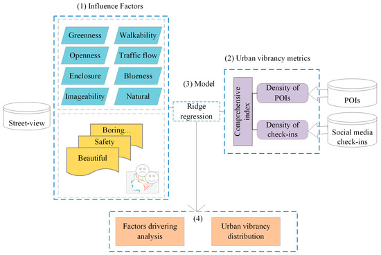 To address the above issues, this study proposes a new framework to study the factors influencing urban vibrancy at the street level based on multi-source data. The emergence of labeled geographic big data, especially street-view data, provides great advantages for mapping the impact of physical environmental factors as well as non-physical environmental factors on urban vibrancy in street micro spaces. Firstly, a comprehensive urban vibrancy index is calculated using the adaptive weighting of two types of urban sensing data, namely, POI and check-in data, as a suitable proxy for accurately quantifying vibrancy. POI data can reflect the location of human activities and portray vibrancy in terms of physical space; check-in data can portray human activity patterns and portray vibrancy in terms of human activity space. Combining the two can portray vibrancy in a more comprehensive and effective way. Secondly, the factors influencing urban vibrancy are portrayed in terms of both urban visual–spatial and psychological perception. A full convolutional network (FCN-8s) is used to segment the streetscape images of Beijing and use them as a basis to extract the above features that influence urban vibrancy. Thirdly, exploring the influencing factors of urban psychological perception reveals the deeper causes of the impact of psychological perception on urban vibrancy. Finally, an improved ridge regression model is proposed to model the relationship between features and vibrancy, reducing the covariance between features while avoiding the reduction of important features.