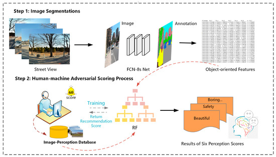 As shown in Figure 3, we used the human–machine adversarial deep learning model proposed by Yao et al. [73] to obtain the urban visual–spatial and psychological perception factors. The detailed process is as follows.