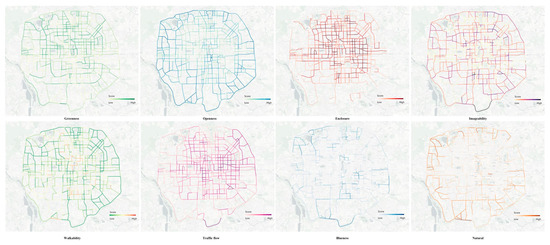 where , , , , , , , and denote greenness, openness, enclosure, imageability, walkability, blueness, traffic flow, and natural, respectively, are calculated in detail in Table 2. is the total number of sampling points.