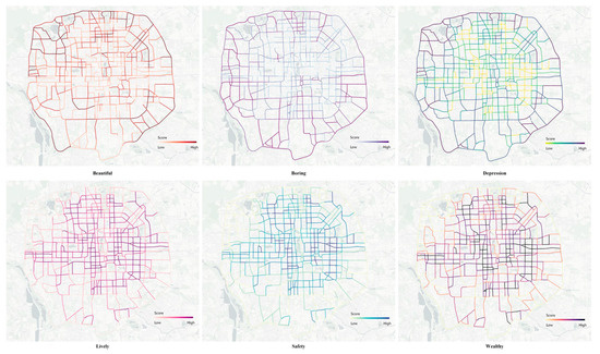 The spatial distributions of the six urban psychological perceptual indicators are displayed in Figure 5. For urban psychological perceptual indicators, the mean value of beautiful is 40.086. Streets with higher beautiful values are usually located near the Beijing district’s boundary. The mean boring value is 61.352. The streets with higher boring values are located north and south of Beijing. The mean depression value is 55.081. Streets containing higher values of depression are distributed in the inner district. The mean scores of lively and safe are 50.765 and 44.391, respectively. Lively and safe exhibit a consistent spatial distribution, and downtown areas are more lively and safer than the surrounding suburbs. The mean value of wealthy is 52.777, and high wealthy values are more evenly distributed.