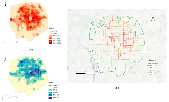 Spatial distribution of urban vibrancy within Beijing’s Fifth Ring Road. (A) POIs. (B) Social media check-ins. (C) Comprehensive vibrancy.