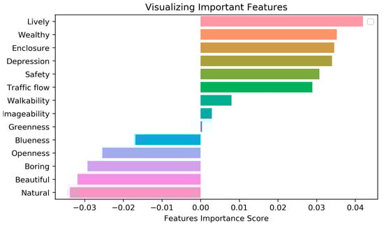 We developed three models, the results of which are presented in Table 4. The performances of the three models were evaluated using two indices: R2 and k-fold value. Particularly, models 1, 2, and 3 have R2 values of 0.706, 0.743, and 0.807, respectively. In addition, the k-fold values are 0.660, 0.700, and 0.75 for models 1–3, respectively. The R2 and k-fold estimates increase from model 1 to model 3, and the fairly high values guarantee the performance of the regression model. From model 1 to model 2, the accuracy improved by 3.7 percentage points. The comparison result also reveals that urban psychological perceptual features have a more significant effect on urban vibrancy than visual–spatial features. From model 1 to model 3, the accuracy improved by about 10 percentage points. The results indicate that combining visual–spatial features and urban psychological perceptual features with regression approaches improves the R2 significantly, and enhances model performance. Most importantly, the model that included all variables achieved the best performance. It is suggested that neither physical environmental nor non-physical environmental factors alone are sufficient to fully explain the factors influencing urban vibrancy, which confirms the conjecture proposed in this study. As can be seen in Table 5, urban vibrancy also affects visual–spatial factors and psychological characteristics to varying degrees. The regression coefficients indirectly indicate which variables contribute more to the model’s goodness of fit, and they signify the importance of the variables. The ranks of the impacts of the 14 variables on urban vibrancy are shown in Figure 7.