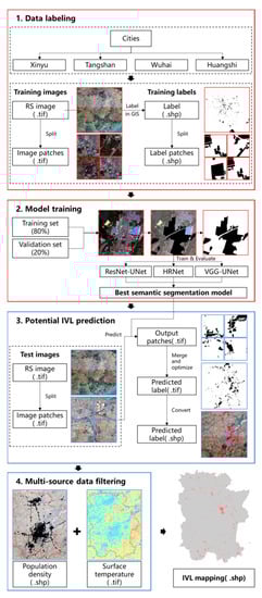 The entire automatic detection method includes two main stages: (1) predictive recognition of potential IVL through semantic segmentation models, followed by (2) IVL filtering using population density data and land surface temperature data. To ensure the accuracy of the semantic segmentation model and the feasibility of the subsequent filtering process, we developed a four-step framework (Figure 2) as follows: (1) data labeling, (2) model training, (3) potential IVL prediction, and (4) multi-source data filtering. The goal and contents of each step are described below.