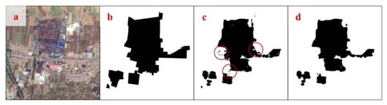 The purpose of this step is to obtain high-quality potential IVL prediction results in the form of vector data. We used the following methods to accomplish this goal and ensure the quality of the final results: (1) During model training, we installed the GDAL library for Python, enabling the use of TIFF data for both image input during model training and the segmentation results of the model output. (2) We found fine points on both the edges and interior of the images. To reduce the amount of potential error when converting raster to vector files, we employed the ArcScan tool for raster refinement procedures. A morphological closing operation was performed on the predicted IVL raster. This operation effectively smooths out coarse boundaries within the raster while also appropriately filling small gaps between foreground objects, aiming to yield a raster with distinct boundaries and comprehensive internal filling. This practice is also advantageous for subsequent conversion into vector files, contributing to the creation of more precise potential IVL polygon vectors (Figure 4). Regarding the transformed outcomes, it was observed that, despite the morphology operations, certain independent and significantly small portions persisted within the vectorized polygons. Upon meticulous observation, statistical analysis, and considering the subsequent research’s data requisites, independent polygons with an area of less than 400 m2 were identified as noise and subsequently removed.