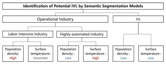 To confront these problems, we aim to put forth a comprehensive methodology and framework for identifying large-scale IVL utilizing open-source data. This proposed methodology can be readily adapted and implemented in different countries and regions, offering a novel approach for IVL identification and analysis. Specifically, we propose a method to identify IVL based on satellite RS images and multi-source data. The main goal of this study is to achieve the automatic identification of potential IVL based on semantic segmentation of Sentinel-2A RS images, and to determine the true IVL characteristics by removing still-operational industrial sites based on population density and surface temperature inversion data. We compared three semantic segmentation frameworks—HRNet, ResNet-UNet, and VGG16-UNet—and then built a potential IVL semantic segmentation model based on the best-performing HRNet and a filtering mechanism using human density and surface temperature. We validated the whole identification workflow in Tangshan City, Hebei Province, China. The experiments show that the identification model based on HRNet is accurate, stable, efficient, and robust, and the filtering mechanism can cover most of the research objectives. This identification framework provides a reference method for various countries and regions to identify IVL on a large scale, which is of great significance for advancing IVL and UVL research and practice worldwide.