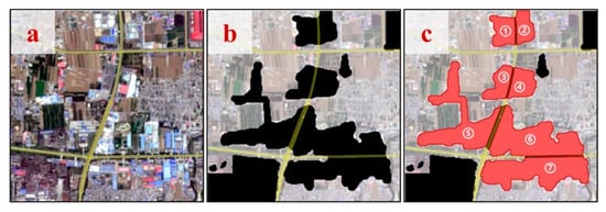 The purpose of this step is to obtain high-quality training data for the semantic segmentation model of potential IVL. Labels were created for potential IVL with industrial surface features in the three investigated cities. To ensure effective training results, these labels were required to meet the following three conditions: (1) cover a large number of potential IVL with different surface features, (2) ensure a wide range of industrial and non-industrial surface changes to enhance the robustness of the trained model, and (3) ensure a sufficient number of samples to control overfitting.