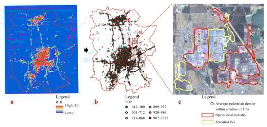 Filtering is first applied using population density data. (a) Performance on the client side of the Baidu heat map. (b) Population density vector point data after vectorization calculation. (c) Difference in population density between operational industry and potential IVL.