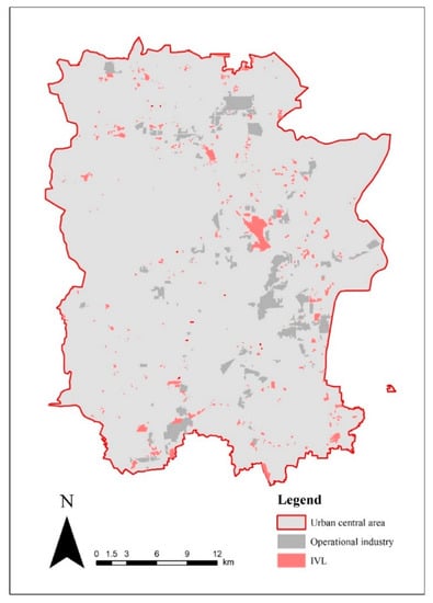 After completing the entire workflow, we mapped the industrial land still in operation and IVL in the central urban area of Tangshan City, as shown in Figure 9. The number, area, and geographic distribution of IVL, as well as the vacancy rate of urban industrial land were obtained from the results as expected. We identified 592 potential IVL areas in the central urban area of Tangshan. After screening with surface temperature and population distribution data, 431 IVL areas were extracted, covering an area of approximately 24.2 km2. The results show that approximately 34% of the total industrial land in the central urban area of Tangshan is vacant.
