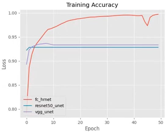 Figure 11 demonstrates that the accuracy of HRNet continues to increase and reaches nearly 1 at the end of training, whereas the accuracies of ResNet-UNet and VGG16-UNet increase over the first few epochs but then remain essentially constant at an accuracy of approximately 0.93. It is notable that the value of accuracy is much higher than precision and recall. This may be because the background pixels dominate the dataset, making it easier for the model to learn the features of the background and predict most pixels as background, resulting in a higher accuracy rate.