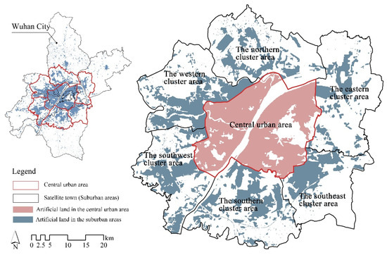 This research selected the Wuhan metropolitan development area as a case due to its high level of information technology and huge population. Wuhan, the capital city of Hubei Province, is a central metropolis of millions of inhabitants in Central China, with an area of 8569.15 km2 and a population of around 12,326,500 people, according to the seventh national census in 2020. More importantly, as of 2021, Wuhan ranked among the top ten areas in the country in terms of internet development, with over 9.11 million internet users and over an 80% internet penetration rate, owing to the fast expansion of the information sector and the strong momentum of information development [47]. As the main concentration of functions and population in Wuhan, this area, which is the “central main city and six satellite distant cities” urban development pattern reflected in Figure 1, has a sufficient number of information technology samples and a physical facility configuration, so it was appropriate to study the spatial representation of VSN used by metropolitan residents in the context of rapid information technology development within its scope.