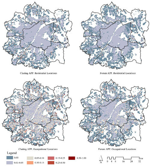 Methodologically, a valuable contribution of this study is the higher accuracy of app usage data provided by mobile devices compared to social networking site data with self-injected personal information, made possible by the real-name registration capability of Chinese phones [66]. On the other hand, these data provide the daytime workplace and nighttime residence where app users spend long periods of time, making up the geographic location of their primary living space, and is able to correlate virtual social behavior with the living environment. The combined analysis is valuable as it makes possible a quantitative analysis of the relationship between virtual behavior and social attributes from a geospatial perspective. Hence, the current study represents an inventive, albeit constrained, attempt to better grasp how individual living environments, such as occupational and residential locations with their surrounding physical social environments, affect virtual social behavior.