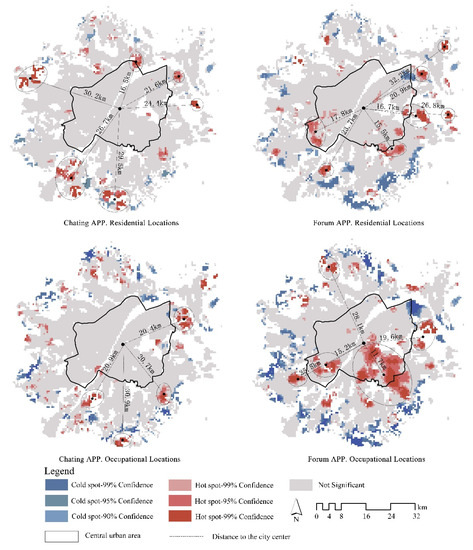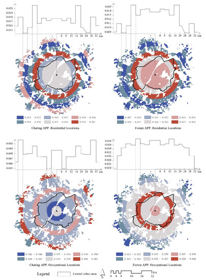 Meanwhile, the extreme points of VSA user proportion are more clearly located by the hotspot map in Figure 5. In particular, there are differences in the peak clustering locations of the residence and workplaces of the two types of VSA users: while the residences and workplaces of those who use chatting apps are primarily clustered within 20 to 30 km away from the city center, forum app users’ locations of residence and employment are primarily clustered in the southeast, near the suburban border, with the mass center of the clustering area nearly 10 km away from the city center. The other peak locations are still within 15 to 30 km away from the city center, though there is a large-scale concentration of forum app users who work at least 10 km away from the center. Overall, Wuhan citizens who live or work in the suburbs around 20 km away from the city center are more likely to use VSAs.